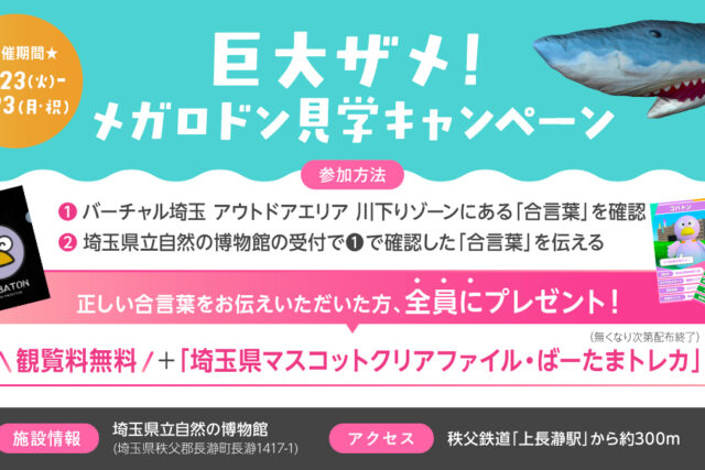 アウトドアエリアの川下りゾーンには、巨大ザメ・メガロドンの復元模型などを展示している埼玉県立自然の博物館を表現した施設があり、3Dのメガロドンがいます。付近のパネルに「合言葉」を掲示しているので、その「合言葉」を埼玉県立 […]
