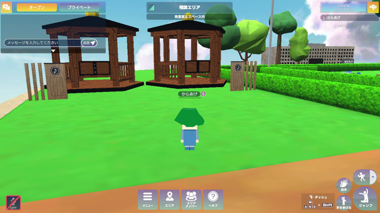 画面下部の「エリア」をクリックして、エリア選択画面から「相談エリア」を選択(アバター操作方法の画面が出たら「閉じる」をクリック)。